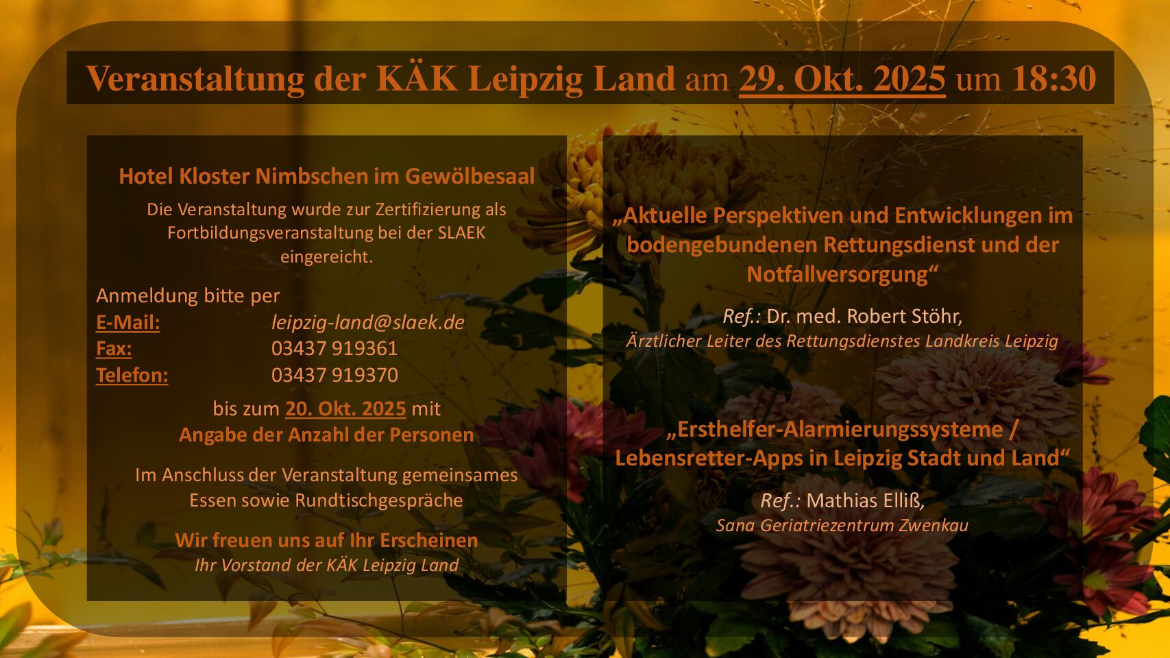 Wir laden am 29. Oktober 2025 ab 18:30 zu einer weiteren Fortbildungsveranstaltung im Gewölbesaal des Kloster Nimbschen ein: „Aktuelle Perspektiven und Entwicklungen im bodengebundenen Rettungsdienst und der Notfallversorgung“Dr. med. Robert Stöhr, Ärztlicher Leiter des Rettungsdienstes Landkreis Leipzig sowie „Ersthelfer-Alarmierungssysteme / Lebensretter-Apps in Leipzig Stadt und Land“Mathias Elliß, Sana Geriatriezentrum Zwenkau Um Anmeldung per E-Mail an leipzig-land(at)slaek.de bzw. per Fax ( 03437 919361) oder Telefon: (03437 919370) wird bis zum 20. Oktober 2025 mit Angabe