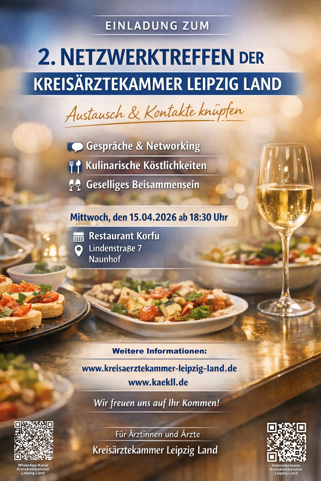Am Mittwoch, den 15.04.2026 ab 18:30 lädt die Kreisärztekammer Leipzig Land erneut im Landkreis tätige Ärztinnen und Ärzte aller Fachrichtungen und Ausbildungsstände aus Klinik und Niederlassung zum2. Interaktiven Netzwerktreffen ein.Die Veranstaltungsreihe findet konzeptionell an wechselnden Orten im Landkreis statt:Diesmal treffen wir uns imRestaurant Korfu in der Lindenstraße 7 in Naunhofzum geselligen Beisammensein, anregenden Gesprächen und Kennenlernen. Wir freuen uns auf